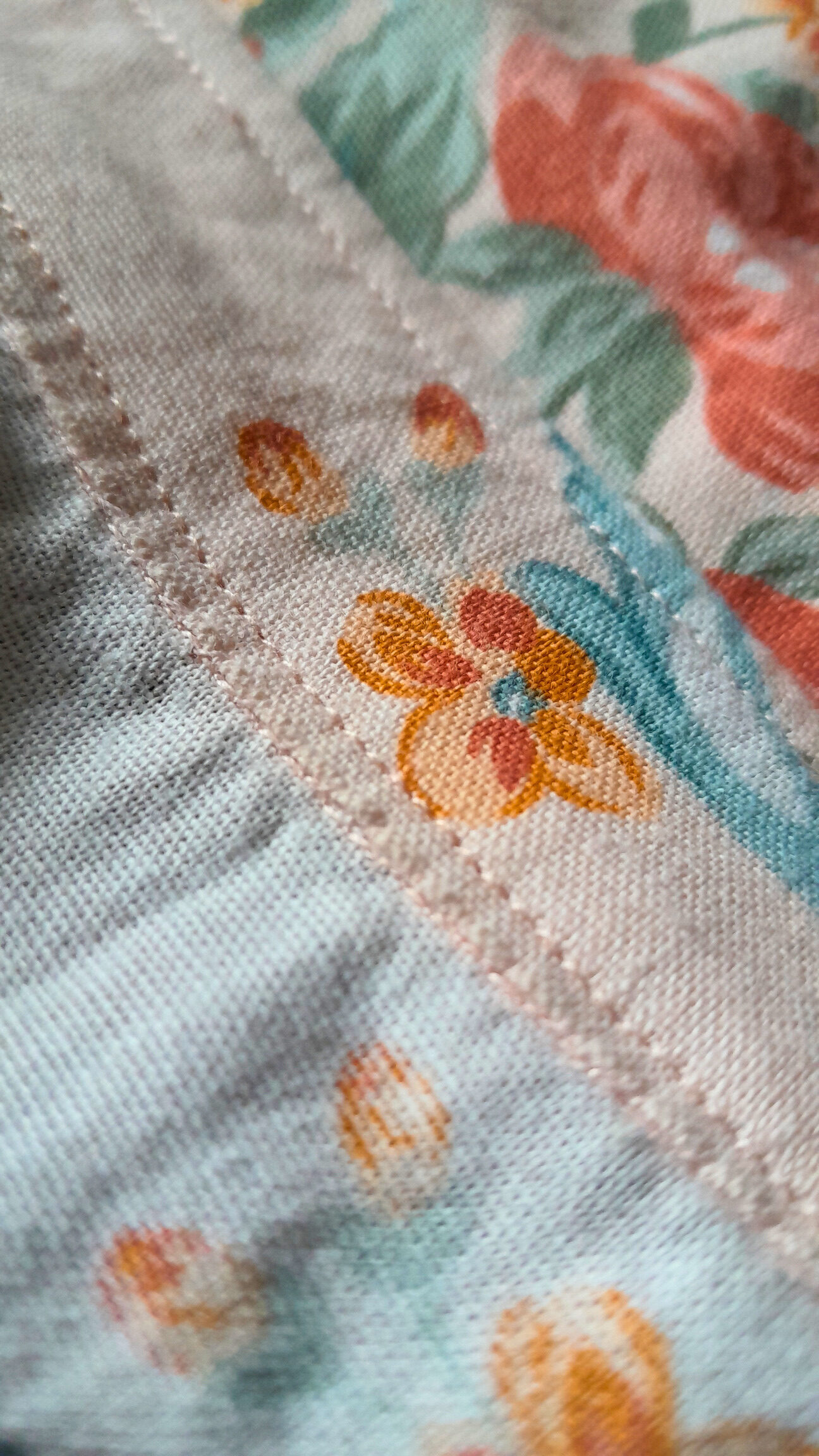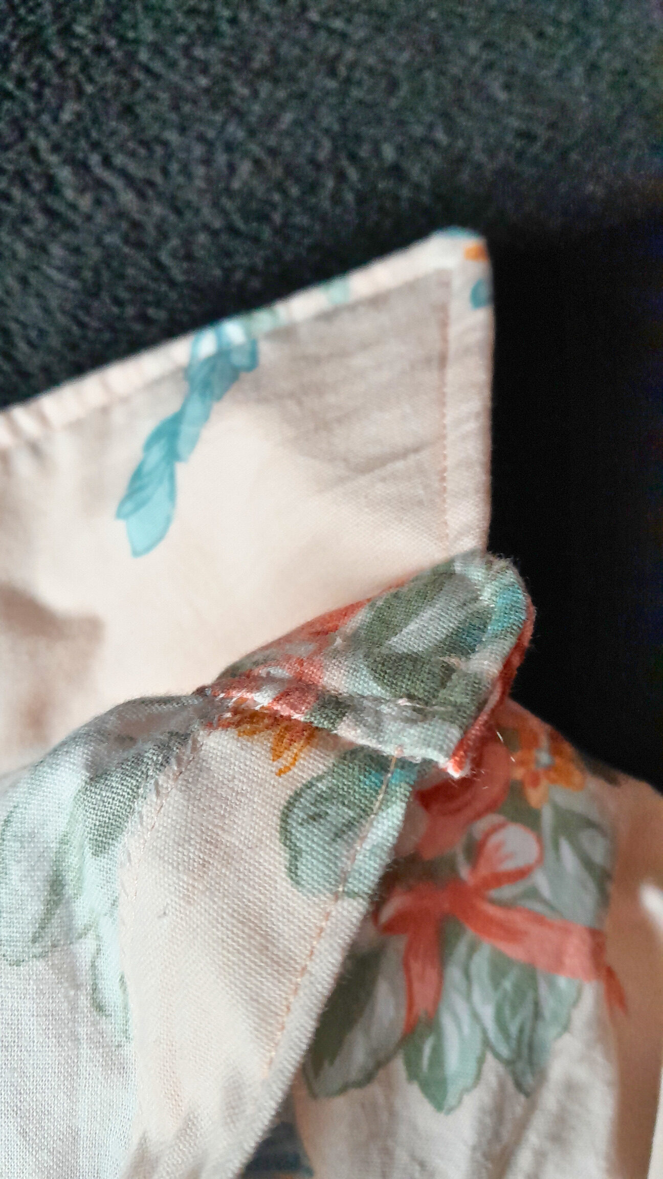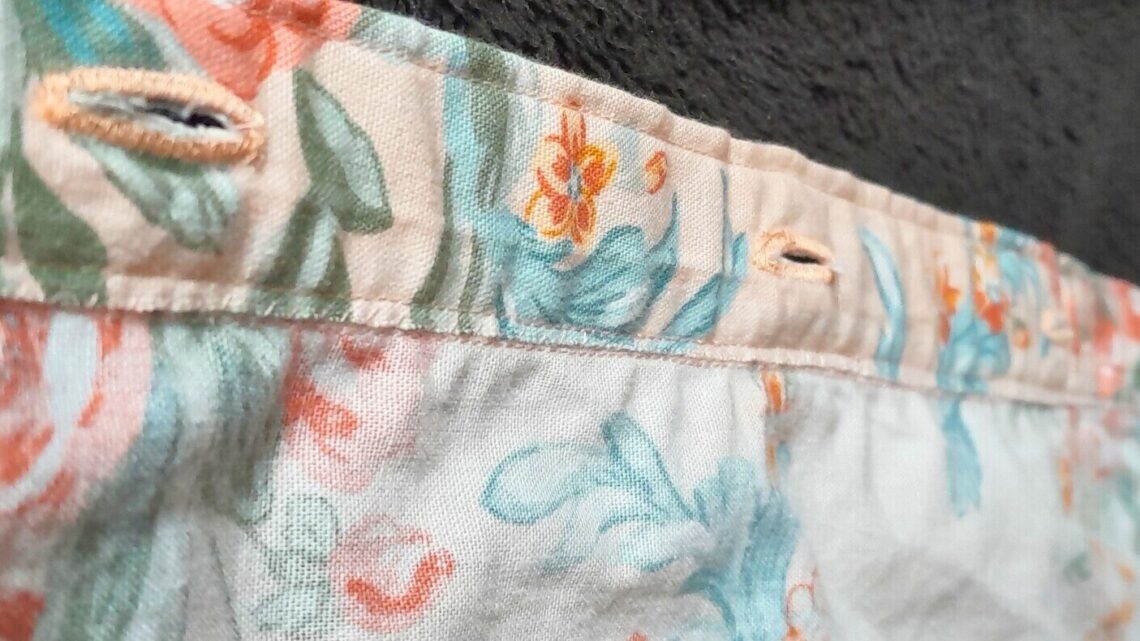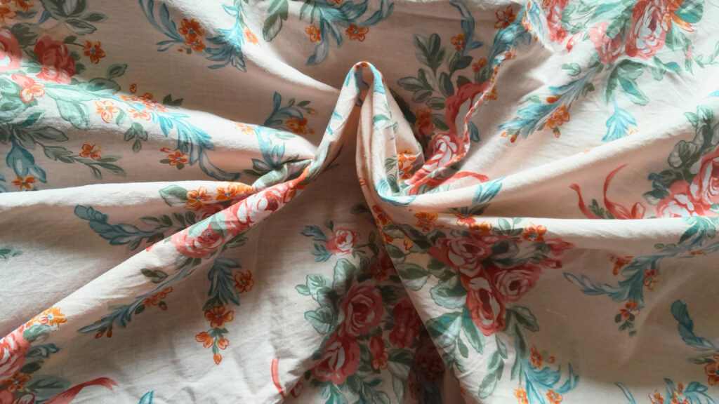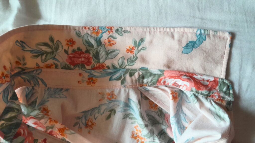 C’est un patron gratuit Mood Fabrics conseillé pour des tissus chaine et trame plutôt légers mais avec un peu de tenue (lin fin, chambray, seersucker). J’ai choisi un drap en coton avec des fleurs vintages sur un fond rose pale acheté d’occasion. Il était, probablement un peu épais par rapport à ce qui était attendu, mais j’aime bien les tissus pas trop fluides.