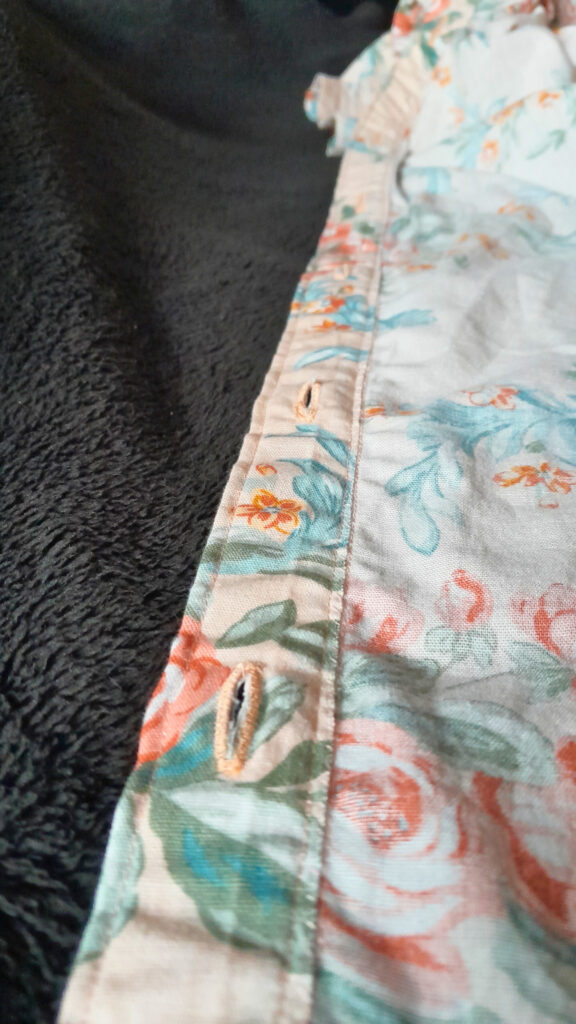 Pour les replis pour les boutonnières, de nouveau, je n’ai pas exactement compris ce qu’ils voulaient que l’on fasse. J’ai un peu improvisé, recoupé les renforts que j’avais prévu à la place de l’entoilage et cousu le tout… avec des gros écarts sur la machine. Finalement, utiliser le bord du tissus n’était pas une si bonne idée car lors de la couture à la machine, le bord renforcé n’a pas réagit comme le reste du tissus et j’ai eu de gros décalages et même un pli. Un peu le même effet qu’un ourlet trop large sur une jupe cercle… Bref, cette fois encore, j’ai tout repris à la main puis surpiqué à la machine par dessus, et le produit fini me convient!
